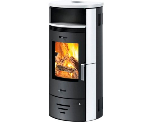 Chimenea moderna de combustión lenta, clase energética A, con una potencia de 7,5 kW y capacidad para calentar hasta 148 m³. Su elegante diseño, con cuero negro y revestimiento cerámico blanco, se integra a la perfección en interiores contemporáneos. Ideal para leña o briquetas, ofrece calor prolongado y un confort visual y térmico superior.